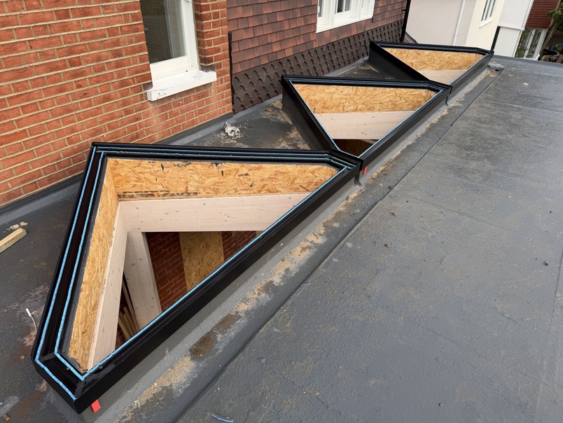 The completed rooflight significantly increased natural daylight within the property while maintaining clean internal sightlines. The bespoke triangular design creates a striking architectural feature and integrates seamlessly with the existing roof structure.